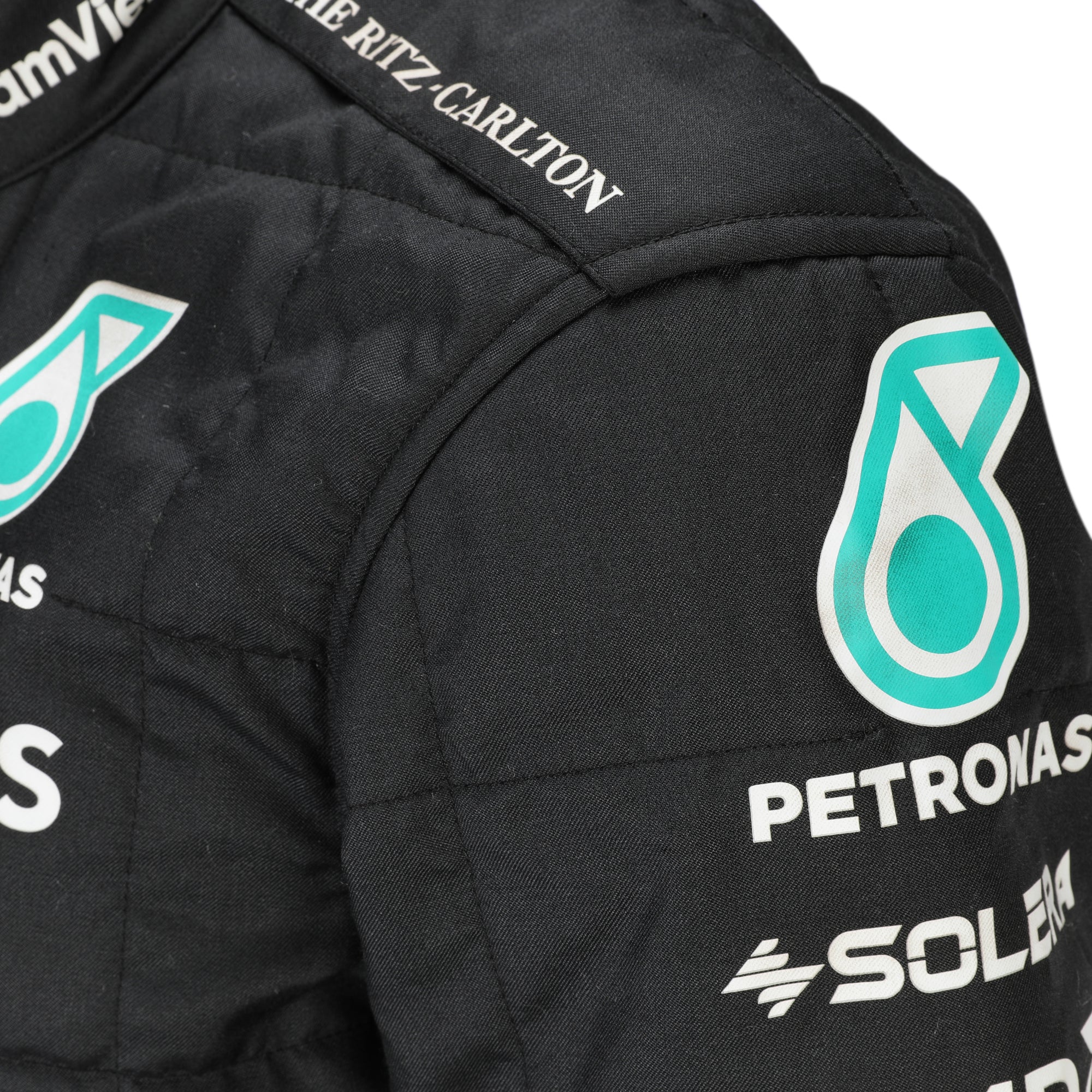 Constructed to FIA fire-resistant standards, the suit was engineered to withstand extreme cockpit temperatures while allowing maximum mobility under sustained G-forces. Featuring the sleek black Mercedes-AMG Petronas livery with contemporary sponsor branding, it reflects the teamās modern identity during a highly competitive technical period in Formula One.